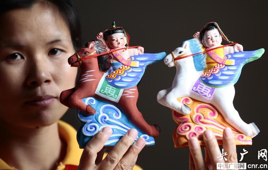 據介紹,這對由工藝美術大師喻湘蓮女士設計的名為“一馬當先福娃”泥塑作品,將民間傳統福娃的形象和馬的形象融合,色彩艷麗,神采奕奕,其中男孩騎赤兔寶馬,女孩騎白龍飛馬,福娃手抓韁繩,好比跨山河,穿云海,虎虎生風,疾馳而行,寓意策馬揚鞭,積極進取,力爭美好生活的精神面貌。