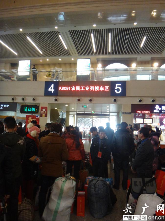 漢口車站為農民工專列開辟了專門的候車區(央廣網記者 劉芳 攝)