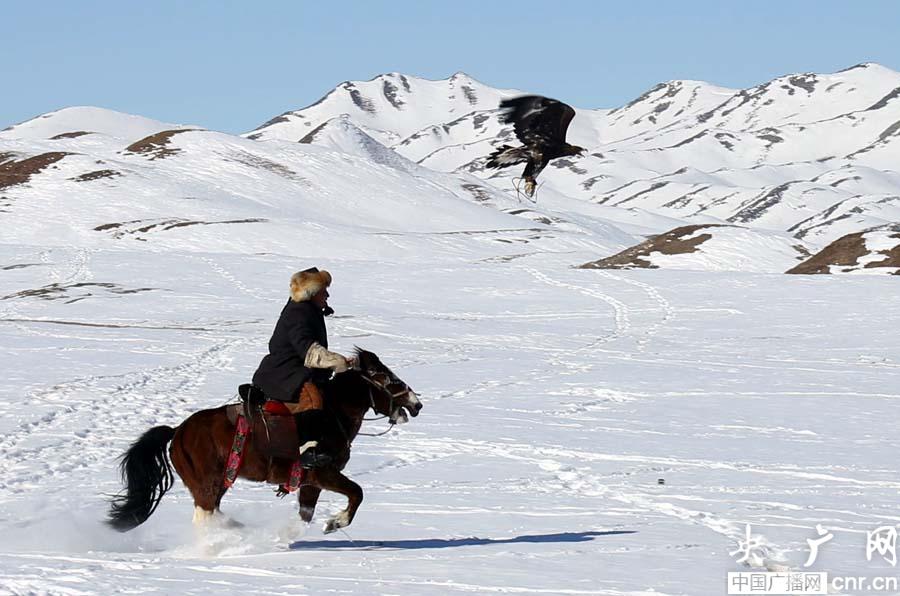 央廣網青河2月17日消息(記者張雷 青河臺記者拉扎提 葉斯波力)新疆阿勒泰地區(qū)青河縣昨天舉辦第二屆“獵鷹比賽”,40多名身騎駿馬、手臂上高舉獵鷹的馴鷹人和近萬名觀眾冒著零下30度的嚴寒參加、觀賞這場別開生面的比賽。