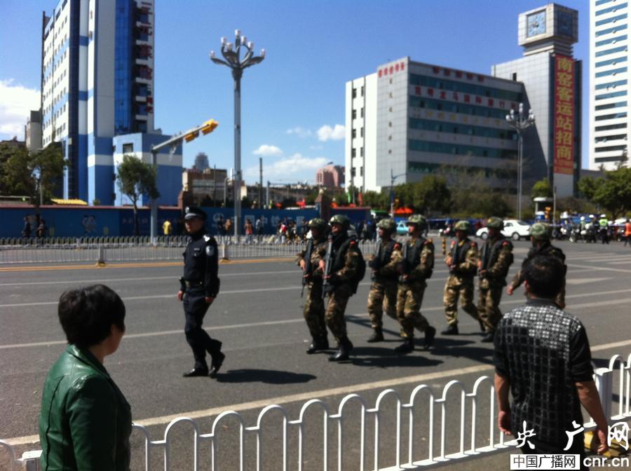 特警在昆明火車站站前路巡邏戒備(央廣網記者 李健飛 攝)