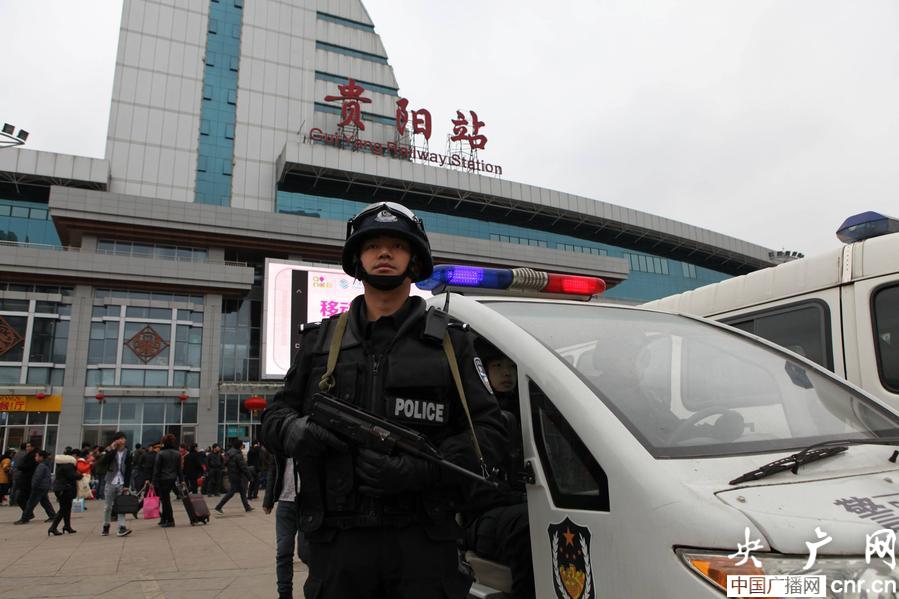 貴鐵警方對(duì)貴陽站前廣場(chǎng)實(shí)行24小時(shí)特警武裝巡邏(央廣網(wǎng)發(fā) 劉念陸 陳長青 攝)