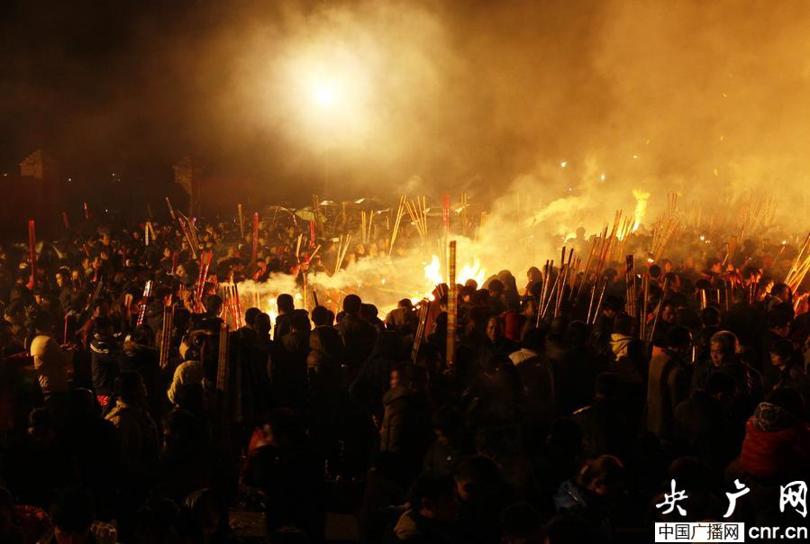 3月8日凌晨,在柳州市柳城縣鳳山開山寺大殿前,各地游客趕來上頭柱香(央廣網(wǎng)發(fā) 鄧克軼 攝)