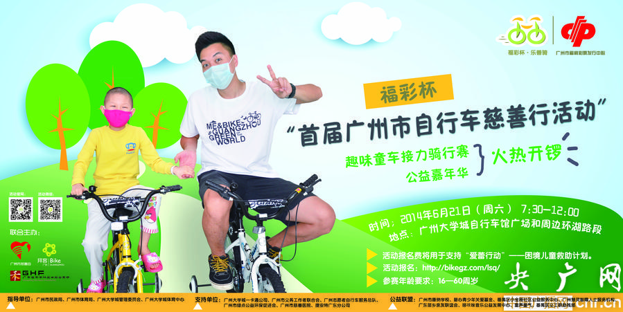 央廣網(wǎng)廣州5月22日消息(記者何偉奇 通訊員文燕媚)經(jīng)廣州市政府同意,廣州市慈善會(huì)、廣東省千禾社區(qū)公益基金會(huì)、拜客廣州將于2014年6月21日上午,在廣州大學(xué)城自行車館廣場(chǎng)及環(huán)湖路段舉辦福彩杯首屆廣州市自行車慈善行活動(dòng),為廣州市慈善會(huì)“愛蕾行動(dòng)”——困境兒童救助計(jì)劃籌集善款。