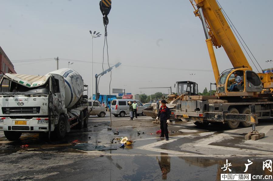 根據(jù)現(xiàn)場初步勘查,事故極有可能是攪拌車駕駛?cè)藶楸茏層肄D(zhuǎn)大貨車緊急向右打方向,致使其側(cè)翻后撞到紅燈等候的1輛轎車和3輛電瓶車,造成電動車上4人受傷、攪拌車駕駛?cè)耸軅,車輛損壞嚴重,F(xiàn)場汽油泄漏嚴重,經(jīng)過交警、消防共同努力,通過水槍沖洗、疏散群眾等方法,稀釋了空氣中汽油含量,預防了烈日天氣下火災發(fā)生。