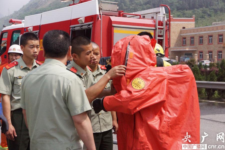 9時15分許,就近的映秀專職消防隊2車10人到場進行前期處置;9時55分,汶川消防中隊3車16人增援到場。經現場偵查發現,消防官兵發生泄漏的罐車載有30.6噸丙烯酸,因后車追尾,致使安全閥損壞而泄漏;根據這一情況,現場指揮部決定架設水槍陣地對罐體冷卻,對泄漏化學品進行稀釋,同時在水槍保護下,利用無火花工具進行堵漏。10時45分,堵漏成功,消防官兵繼續對事故車輛進行監護。