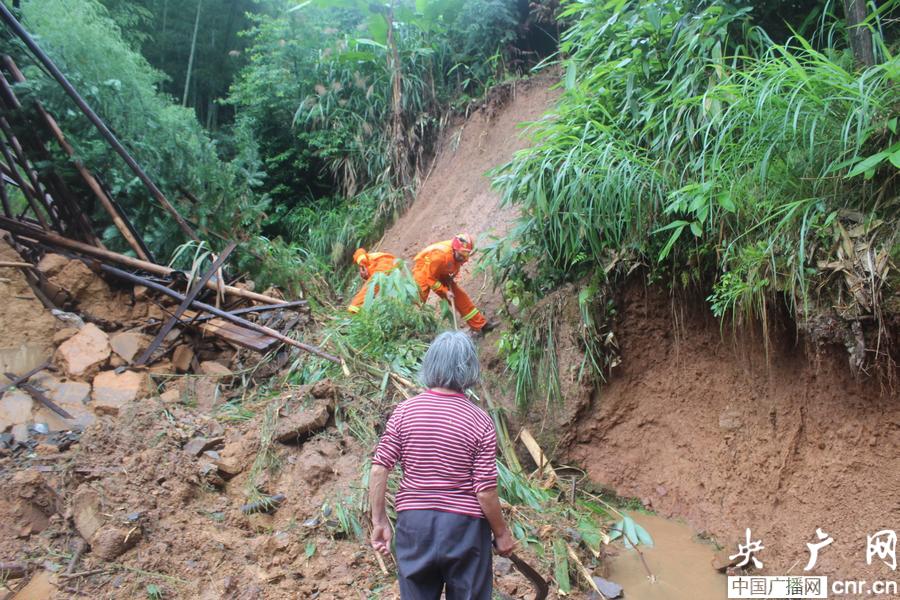 由于山體滑坡導(dǎo)致交通中斷,藍(lán)山縣消防大隊(duì)官兵沿著山路步行進(jìn)入上源村。在現(xiàn)場(chǎng),只見(jiàn)洪水挾帶著大量泥沙和石塊沿著山體傾瀉而下,沖進(jìn)村里低洼地區(qū)的房屋、道路和農(nóng)田,不少房屋進(jìn)水嚴(yán)重,最深的足有六七十公分,屋內(nèi)家具、電器、生活用品泡水,有的已經(jīng)轉(zhuǎn)移到屋外。受災(zāi)最嚴(yán)重的村民有兩間泥土房被崩塌而下的山體壓垮,現(xiàn)場(chǎng)一片狼藉,堆積滿地的樹(shù)木、雜草、石頭等堵住了排水溝,如不及時(shí)清除滑落山體從山上沖下的洪水將直接威脅到其余房屋。消防官兵們拿來(lái)鋤頭、鏟子,鉤刀等工具奮力清除障礙,疏通溝渠,并對(duì)被沖毀的溝渠進(jìn)行加固引流。下午4點(diǎn)半左右,盡管大家頂著暴雨如注,渾身濕透,褲腿甩滿泥土,內(nèi)心卻十分欣慰,洪水得到了有效的疏通,基本保障了村民房屋的安全。