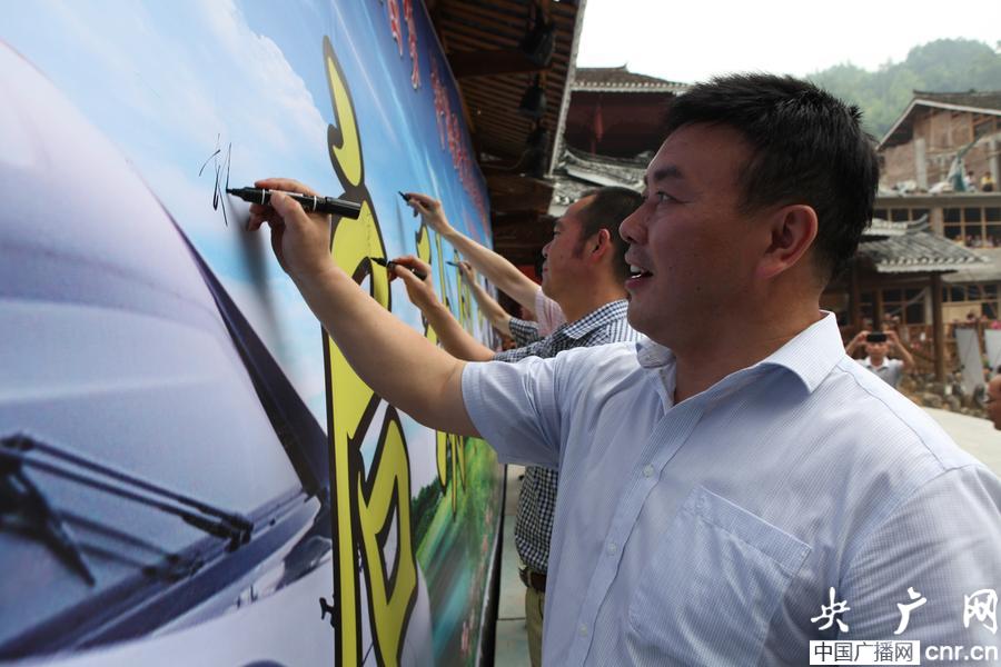 參加高鐵路外安全宣傳的各級領導同志帶頭簽名倡議遵守鐵路安全法制法規(陳玉 攝)