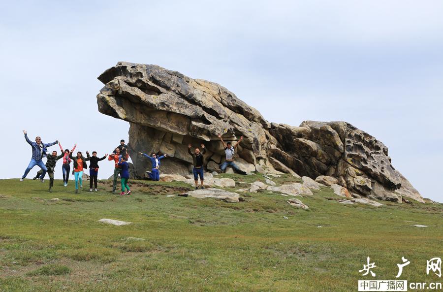 央廣網維吾爾7月30日消息(記者吳卓勝 通訊員董基春)29日,一群游客在新疆焉耆回族自治縣霍拉山區一座酷似臥獸的巨型怪石旁游玩。