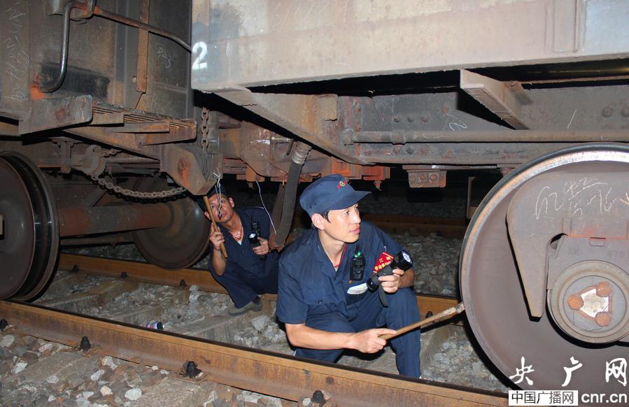 武漢鐵路局江岸車輛段列車檢修員精心挑選車輛(央廣網發 秦濤 攝)
