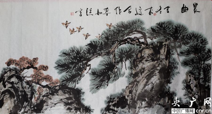 山東省女書畫家協(xié)會(huì)副主席弭金冬為災(zāi)區(qū)義捐創(chuàng)作的國(guó)畫《晨曲》(央廣網(wǎng)記者 柴安東 攝)
