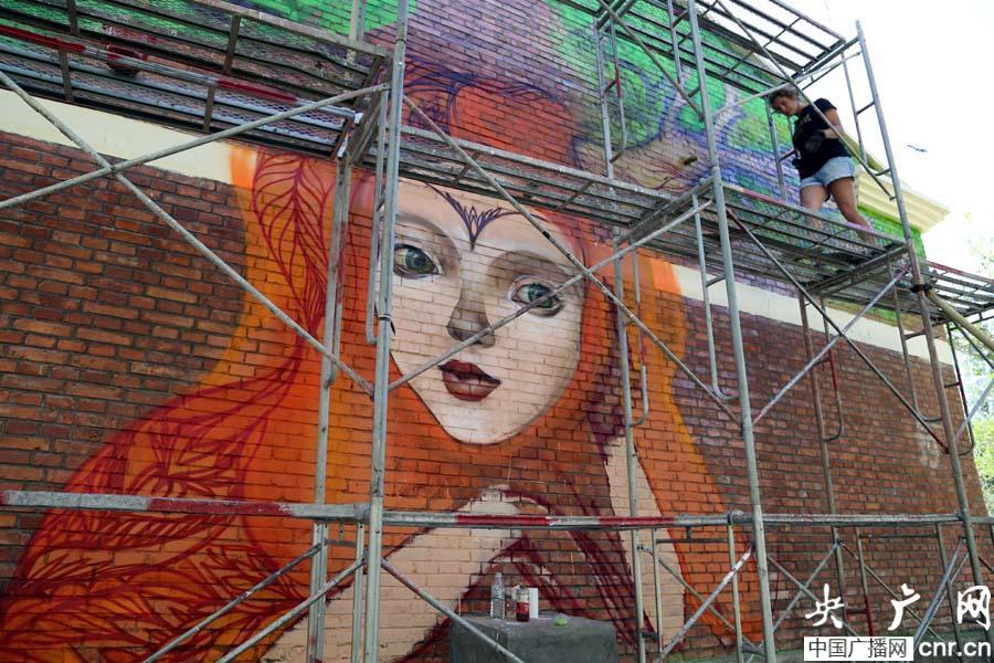 俄羅斯涂鴉藝術家瑪麗娜的作品《美女和樹》(央廣網記者 張雷 攝)