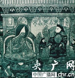 1652年,五世達賴喇嘛阿旺羅桑嘉措進京朝覲順治皇帝(壁畫)(央廣網記者 德慶白珍 攝)