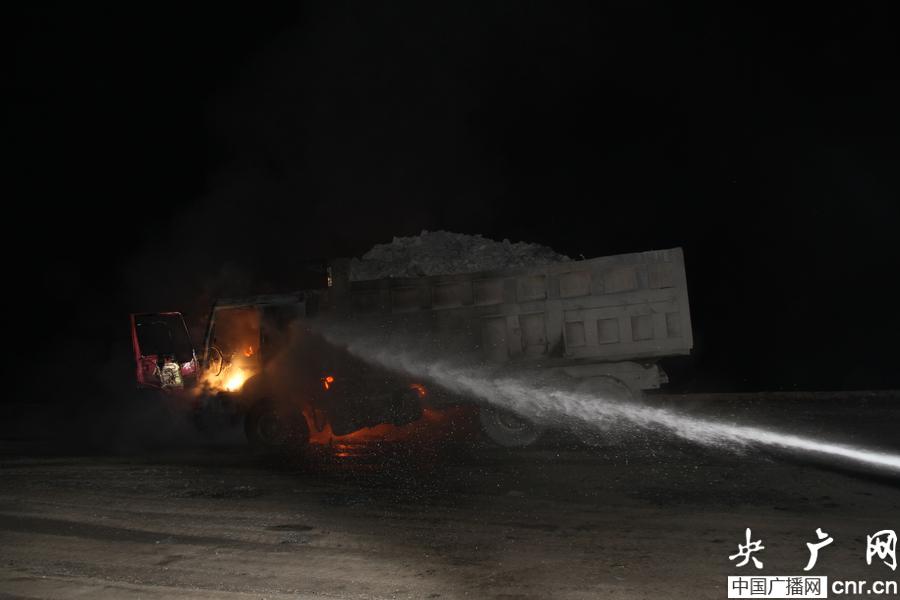 2時25分,黔江消防官兵抵達(dá)現(xiàn)場后發(fā)現(xiàn),一輛重型貨車停在工地道路上,駕駛室內(nèi)正冒著滾滾濃煙,空氣中彌漫著刺鼻的焦味,赤紅的火焰正燃燒著輪胎,時而發(fā)出噼啪聲響,濃濃的黑煙從汽車底部向外冒出,駕駛室火勢正在擴(kuò)大。一旦火勢蔓延到油箱后果將不堪設(shè)想,針對現(xiàn)場情況,消防官兵立即出一支水槍直擊著火點,在泡沫水槍的攻勢下,10分鐘后貨車的火勢很快得到控制,為防止復(fù)燃,消防官兵對貨車冒煙部位進(jìn)行噴水冷卻。