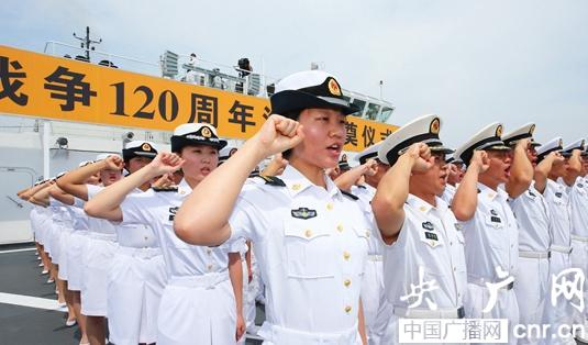 官兵代表莊嚴宣誓:以史為鑒,勿忘國恥;強軍習武,報效祖國;經略海洋,維護海權;建設海軍,夢圓中華。錚錚誓言響徹海域上空。