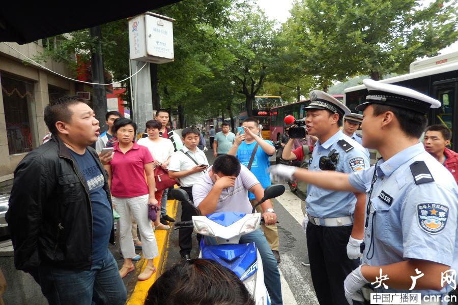 交警現場開出電動自行車載人50元罰單。(央廣網記者 溫超 攝)