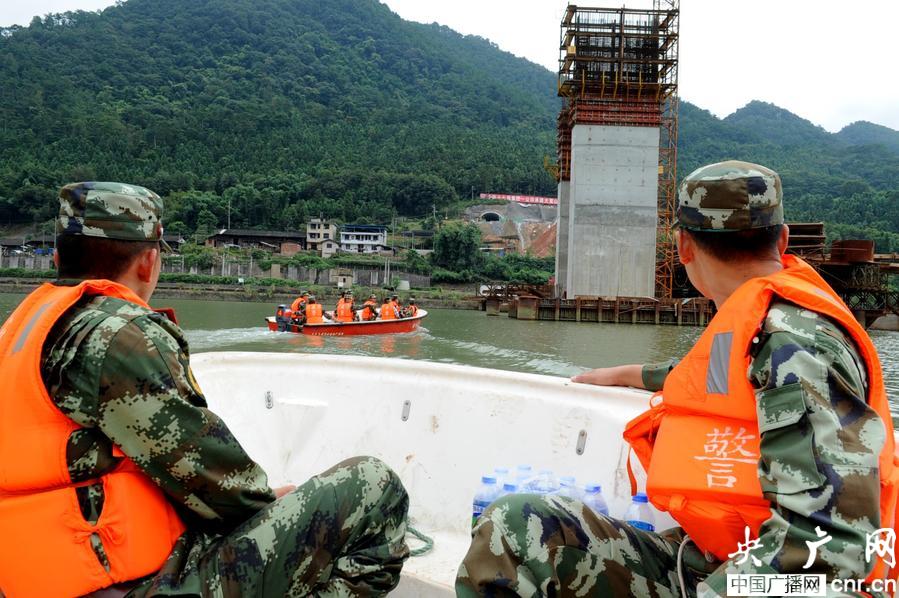 9月23日凌晨,福建省南平市西芹鎮一大橋工地,一艘漁船被河水沖翻,因河水湍急,岸上群眾無法實施救援,南平市地方政府向當地武警求援。武警福建總隊南平支隊迅速成立救援分隊,攜帶沖鋒舟、救生裝置等搶險器材趕赴現場進行救援。到達事發現場后,該支隊官兵分為四個救援小組,兩組乘坐沖鋒舟在水面進行搜救,兩組官兵沿河道15公里范圍內進行搜救。
