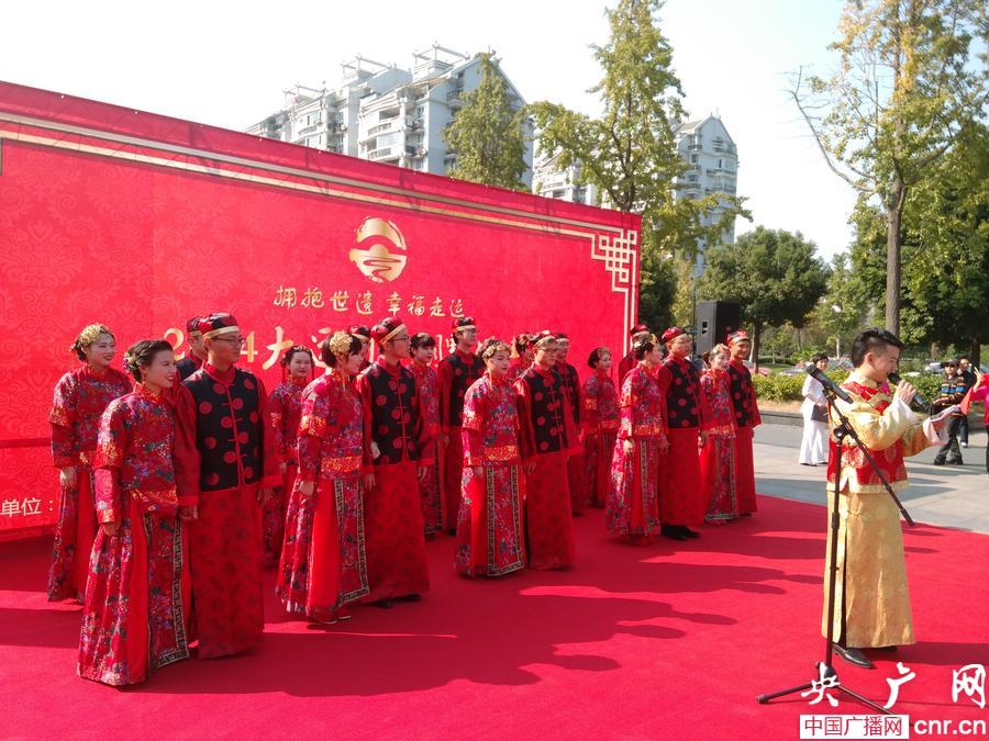 央廣網杭州10月25日消息(記者張國亮)今天下午,10對新人在杭州拱墅區在大運河旁邊的信義坊廣場和富義倉等遺址點舉行了“湖墅婚典”傳統式集體婚禮,以此來慶祝大運河今年申遺成功。大運河湖墅婚典承載著復活運河婚俗文化、促進產業發展,帶動旅游觀光業發展的重任。此次婚典采用中式婚禮,整個流程包括橋西待嫁、漕坊接親、信義盟誓、富義娶親、運河走運、香積祈禱、大兜喜宴等,每個流程都融入了大運河的元素。