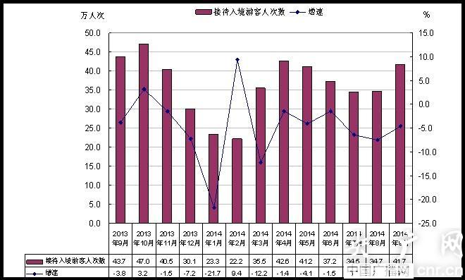 入境旅游市場小幅下降。1-3季度,接待入境游客312.9萬人次,同比下降5.9%。其中,接待港澳臺游客45.4萬人次,下降0.7%;接待外國游客267.5萬人次,下降6.7%。實現旅游外匯收入33.3億美元,同比下降5.9%。