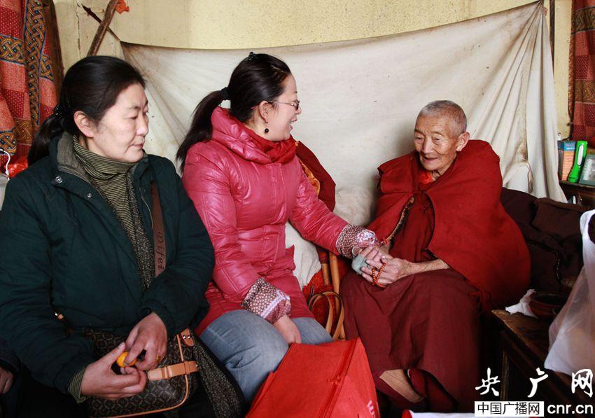 在繞賽社區的居民大院中,年過八十高齡的益西卓瑪老人告訴記者,這些工作隊隊員正是在挨家挨戶為社區內的孤寡老人送東西。益西卓瑪老人緊握起工作隊的隊員的雙手對記者說:“考慮到現在年底將至,氣溫急降,這些孩子們特意為我們這些無依無靠的老人們精心購置棉絮被、毛毯、酥油、糌粑這些過冬的生活用品。平時里他們為我們辦的特殊門診卡給我們徹底解決了看病的問題,又在過年前給我們添置年貨,他們就像我們的孩子一樣親。”