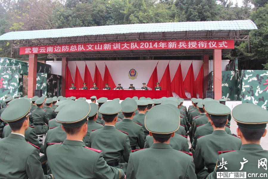 11月12日,云南文山邊防支隊隆重舉行2014年度新兵授銜儀式,新訓大隊160余名官兵參加儀式。上午9時,授銜儀式在莊嚴的《中華人民共和國國歌》聲中拉開序幕。授予列兵警銜的命令宣布后,與會領導為新兵代表佩戴了警銜、領花和帽徽。全體新兵在領誓人的帶領下,緊握拳頭,面向國旗,莊嚴宣誓,立下錚錚誓言。新兵代表做了表態發言,誠懇地表達了扎根警營、獻身邊防的態度和決心。