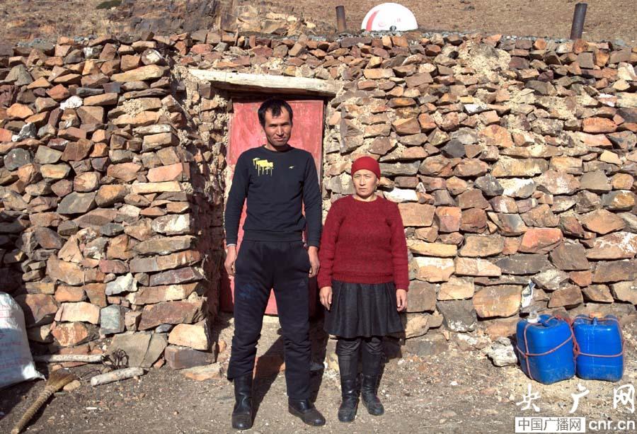 牧民烏馬爾·賽比和他的妻子在冬窩子(央廣網記者 張雷 攝)