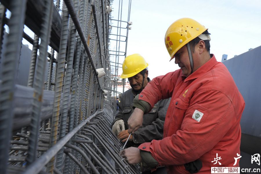 額(額濟納)哈(哈密)鐵路建設中鐵十四局額濟納鋪架基地,工人們正按照標準緊張進行橋梁鋼筋捆綁作業。