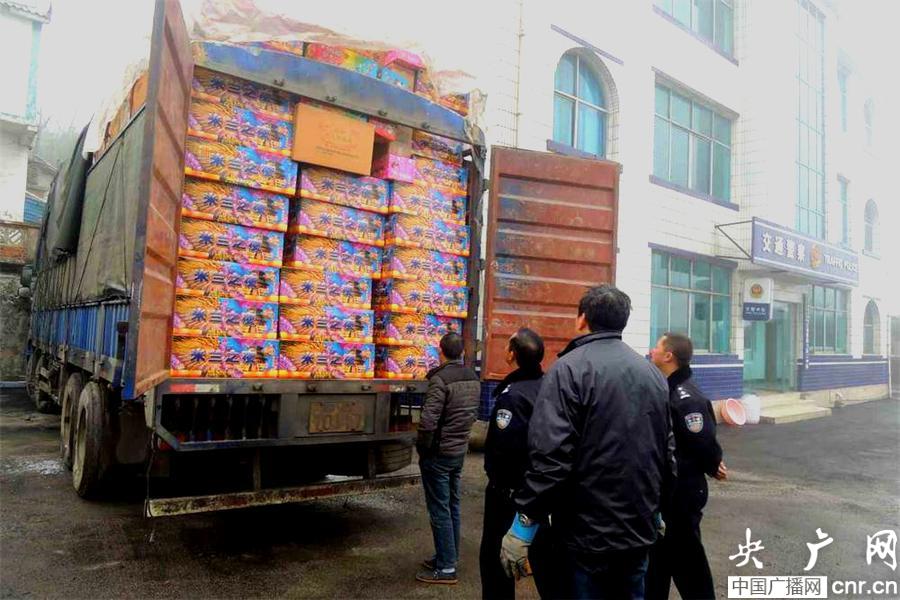 進入冬季,威寧縣梅花山路段進入凝凍常態期,當天晚上10點以后,二中隊民警如往常一樣行進在冰道上巡查過往車輛。10點20分,在102縣296公里處,黑夜中,民警發現一輛車牌為贛CT0117的中型倉柵式貨車行進艱難,上前詢問檢查,讓民警們大吃一驚,整車的煙花爆竹,重量13噸。