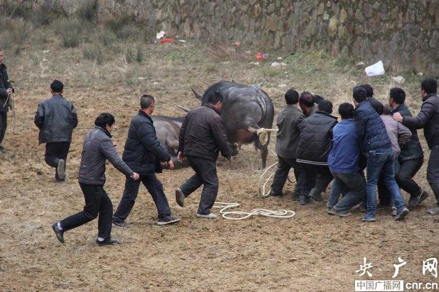 央廣網(wǎng)錦屏1月2日消息(記者王珩 孟海通訊員石福濤 楊俊)2015年1月1日14時許,在貴州錦屏縣彥洞鄉(xiāng)黃門村的斗牛場,隨著斗牛協(xié)會會長王明益的一聲尖銳哨聲的吹響,前來觀看斗牛比賽的二十來個年輕侗寨小伙涌入牛場,兵分兩組將一對打斗了三分余鐘還分不出勝負(fù)的水牛拉住,這是錦屏2015年元旦節(jié)期間黃門侗寨舉行斗牛活動的一角。