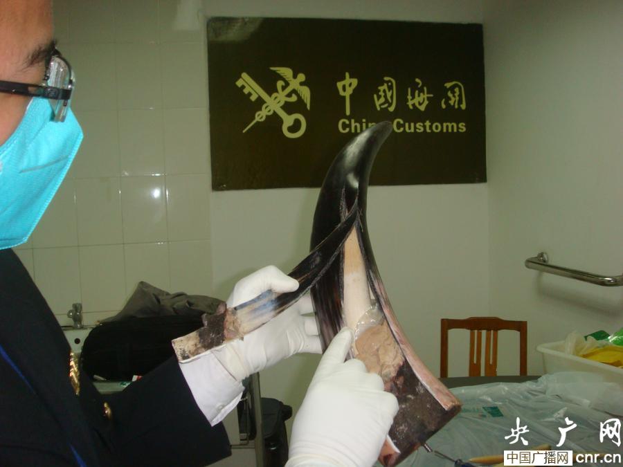 廣州海關查獲利用牛角偽裝走私象牙。(央廣網記者 鄭澍 攝)
