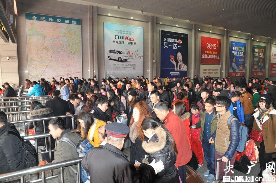 央廣網合肥2月16日消息(記者梁明星)記者剛剛從合肥火車獲悉,今天(16日)合肥火車站迎來返程和發送客流高峰。截至今天(16日)下午3點整已經發送旅客8.7萬人,到達旅客為7萬人。而從預售票情況來看今天(16日)合肥火車站方面發送旅客將突破9萬人,成為2015年春運客流發送最高峰。