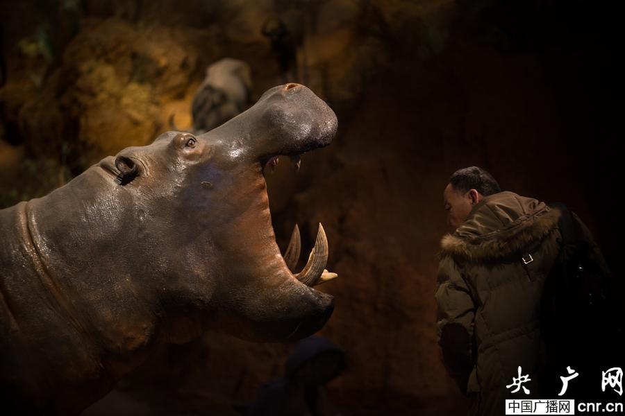 央廣網濟南2月23日消息 (記者柴安東)春節期間,一位市民正在山東省博物館觀看河馬標本。