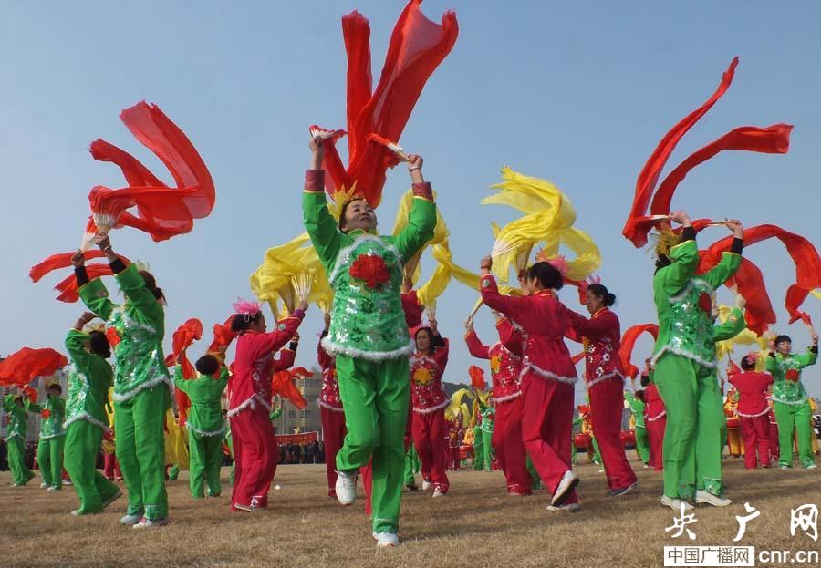震天的鑼鼓敲起來,歡快的秧歌扭起來。在奇臺縣體育場,來自全縣15個鄉鎮社火團們身著節日的盛裝,帶著飽滿的熱情,為群眾帶來精彩的表演。在鏗鏘的鼓點聲中,奇臺鎮秧歌隊鑼鼓喧天,彩練飛舞。碧流河鄉社火隊巨龍飛躍,醒獅翻騰,向觀眾頻頻致意,表達美好祝愿。