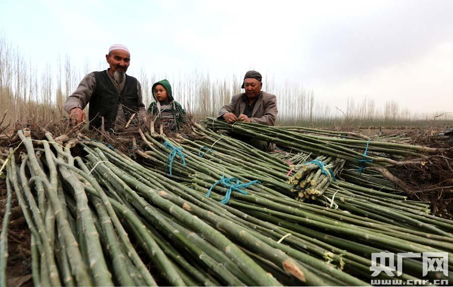 新疆焉耆農民道不代十分失落地在地里扎捆苗木(央廣網發 董基春 攝)