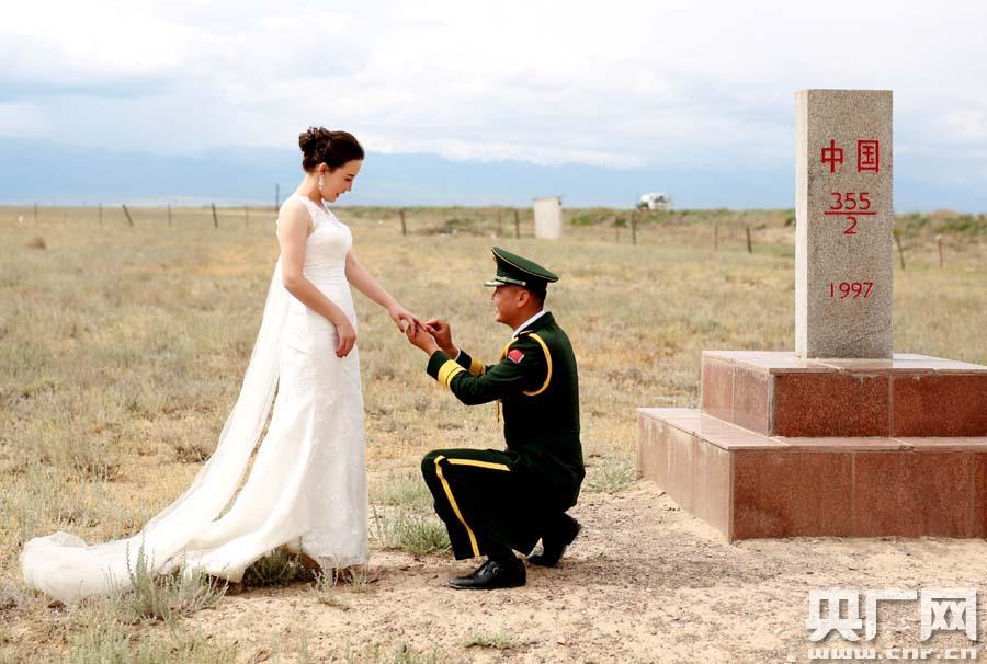 邊檢警官木拉提在界碑為愛人戴上結婚戒指(央廣網發 董紅太攝)