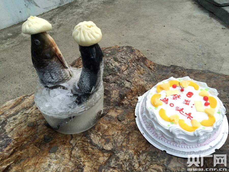 在飼養員把蛋糕和玩具放入運動場內時,“夢龍”已經躍躍欲試了。門一開它急忙跑到了蛋糕前面,先是聞了聞后來還是直接吞掉了一個大包子。然后開始進攻奶油蛋糕,剛開始只是用舌頭舔舔,當舔到露出蛋糕時就開始大口大口的吃了起來不到5分鐘吃的干干凈凈,最后還不忘舔舔盤子。“夢龍”似乎對雙魚蛋糕并不太感冒,直到把另一個大包子吃掉后,才心滿意足的離開。去玩它的新生日禮物——大輪胎。
