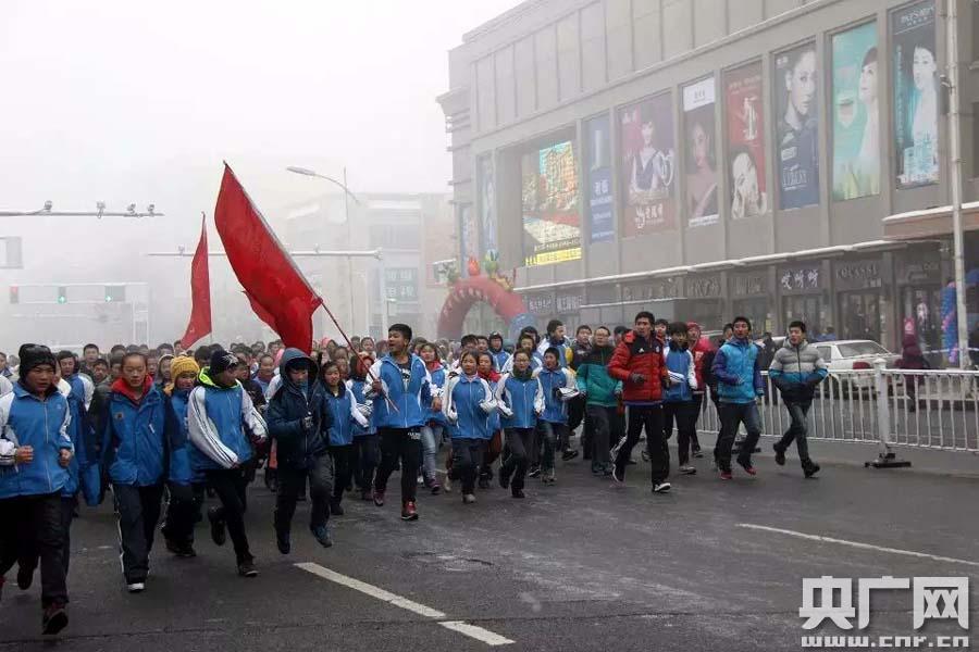 在比賽途中,雖然天公不作美,大霧天氣加之天空飄起雪花,選手們眉毛、頭發上都掛滿了白霜,但擋不住比賽的熱情,選手們邁開步子堅持跑到終點。