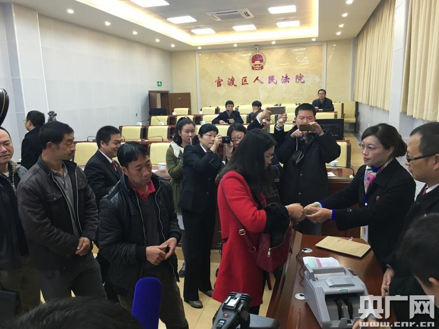 當天,共有40余名申請人從法官手中接過629萬元執行款。(央廣網發 李騰飛 攝)