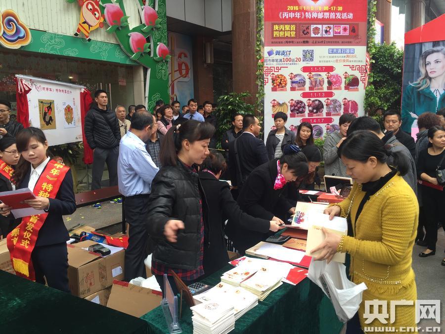 央廣網(wǎng)廈門1月5日消息(記者 馬寧)2016年是農(nóng)歷丙申猴年,喜歡集郵的朋友一定知道猴年對(duì)于集郵界的特殊意義,36年前,我國(guó)工藝美術(shù)大師黃永玉創(chuàng)造了生肖郵票的一個(gè)奇跡,當(dāng)時(shí)票面僅為8分錢一枚的金猴郵票在幾十年間價(jià)格不斷上漲,目前已經(jīng)漲到大約1萬(wàn)2千元左右。時(shí)隔3個(gè)輪回,今年已經(jīng)92歲高齡的黃永玉再次執(zhí)筆,為即將到來(lái)的丙申猴年再度設(shè)計(jì)了一套猴票,今天這套猴票在全國(guó)各大城市發(fā)布,廈門郵政今天總共在市區(qū)四個(gè)點(diǎn)設(shè)立了發(fā)售現(xiàn)場(chǎng),方便市民購(gòu)買。