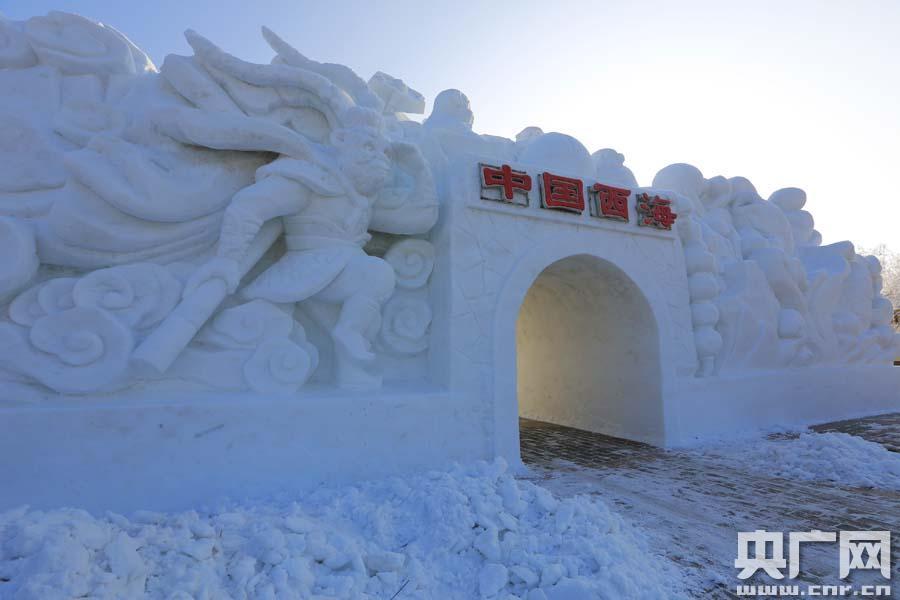 央廣網庫爾勒1月14日消息(記者吳卓勝 巴州臺記者熊光偉 茍秀君)新疆巴州博湖縣博斯騰湖大河口景區的27座冰雪雕現已全部竣工,其中最大、最震憾的雪雕要屬佇立于景區大門“金猴迎春”雪雕,該雪雕長18米、高6米、寬6米。
