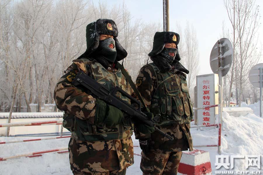 新疆恰爾夏特邊境檢查站官兵寒潮天氣堅守崗位(張巍巍攝)(央廣網(wǎng)記者 張雷 攝)
