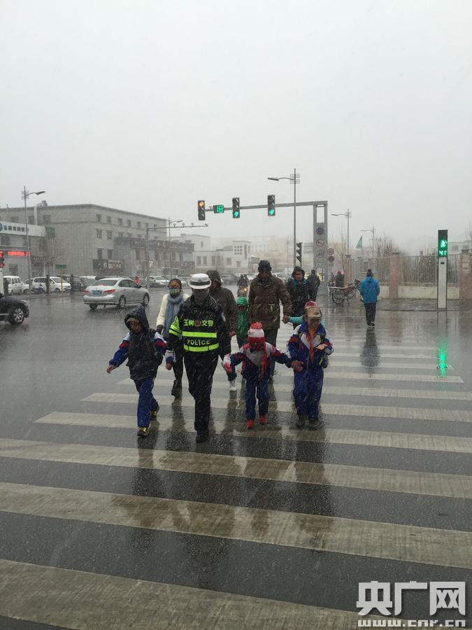 玉樹市紅旗小學學生放學后附近執勤交警帶領學生過馬路(央廣網記者 葛修遠 攝)