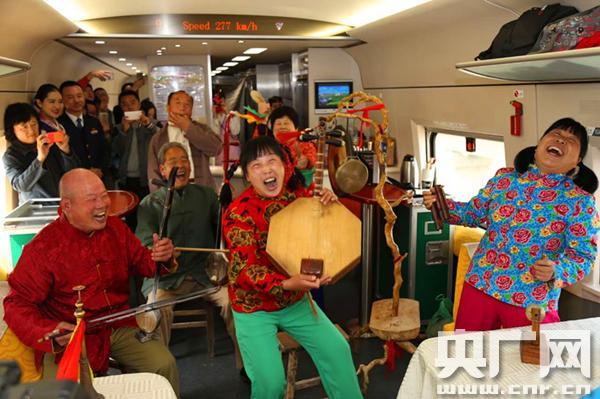 央廣網西安4月3日消息(記者劉濤 通訊員周博倫 張雁南)4月2日,曾參與話劇《白鹿原》演出,并參加2016年中央電視臺戲曲春晚的6位華陰老腔藝人,登上西安北至深圳北的G824次高鐵列車,為清明小長假乘坐這趟列車的旅客帶來了一場原汁原味的關中民俗視聽盛宴。