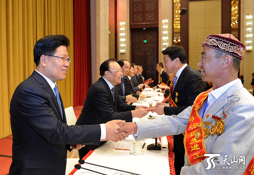 中共中央政治局委員、新疆維吾爾自治區黨委書記張春賢為2016年先進工作者居馬泰·俄白克頒發榮譽證書