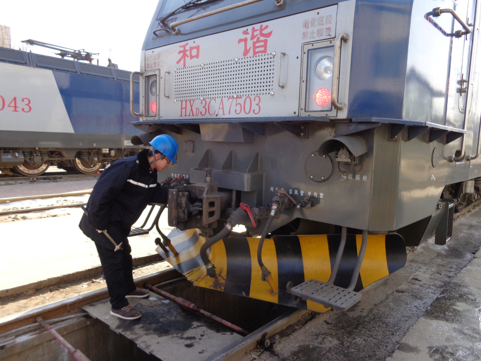央廣網太原1月16日消息(記者李楠 通訊員張秋生)天寒地冷,寒風侵肌。1月15日11時20分,在太原機務段整備場,張輝拿著手電、改錐等工具,麻利地爬上和諧7503號機車。在走廊里,他蹲下認真檢查主機箱。