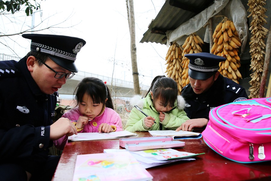 當天,民警在和老人交談中得知他們的兒子、兒媳年底才能回家,為讓老人小孩過上一個溫馨的“暖”年,王鵬帶著民警為他們收拾房間,張貼對聯、“!弊,當大紅的對聯貼上門楹,小慧姐妹兩拿著民警送來的“!弊,激動的在大門口拍照,要把照片發給爸爸、媽媽看。