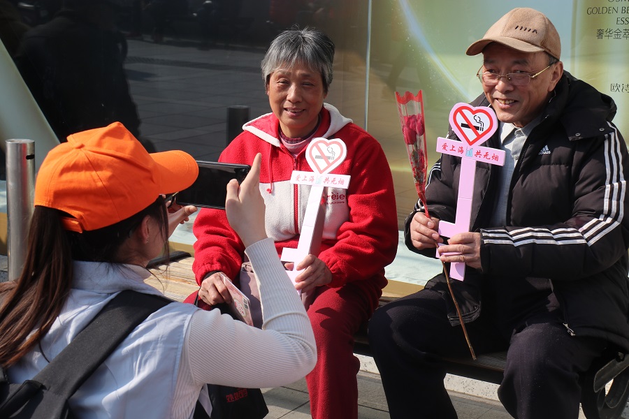 活動現場,志愿者在為一對情侶拍攝控煙視頻