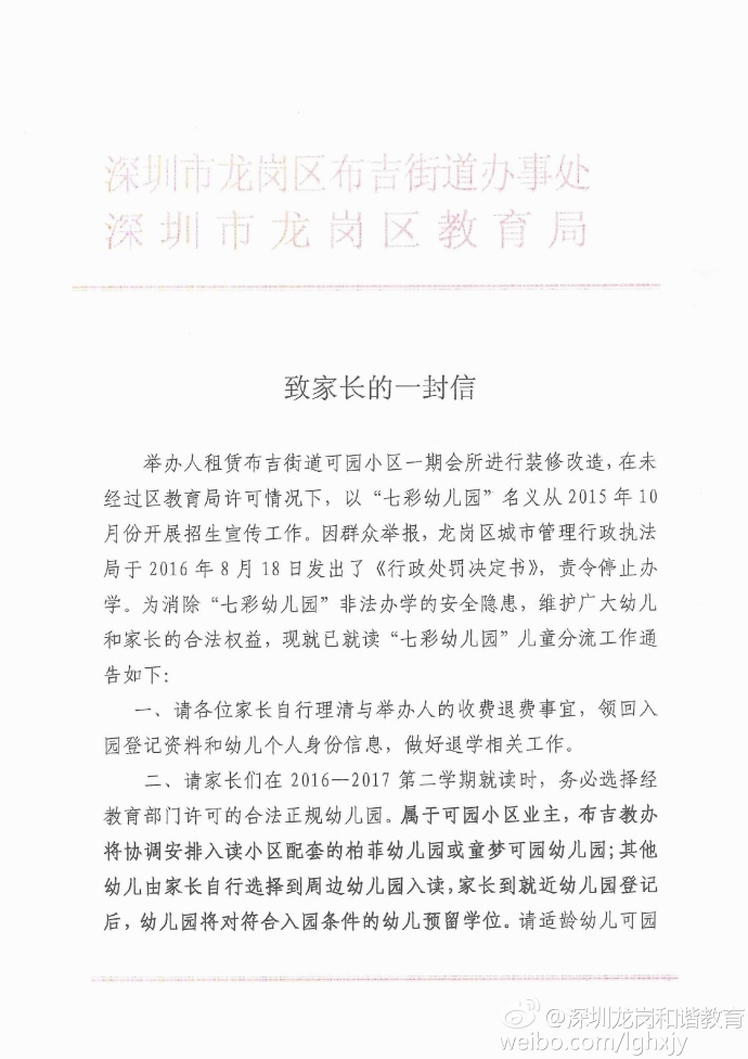 2017年1月10日,布吉街道辦、我局聯合發布《致家長的一封信》,提醒家長在2016—2017學年第二學期就讀時,務必選擇經教育部門許可的合法正規幼兒園,并到社區工作站進行登記,以便做好學位預留。屬于可園小區的適齡幼兒,布吉教辦將協調安排入讀小區配套的柏菲幼兒園或童夢可園幼兒園;其他適齡幼兒安排入讀就近的普惠性幼兒園。