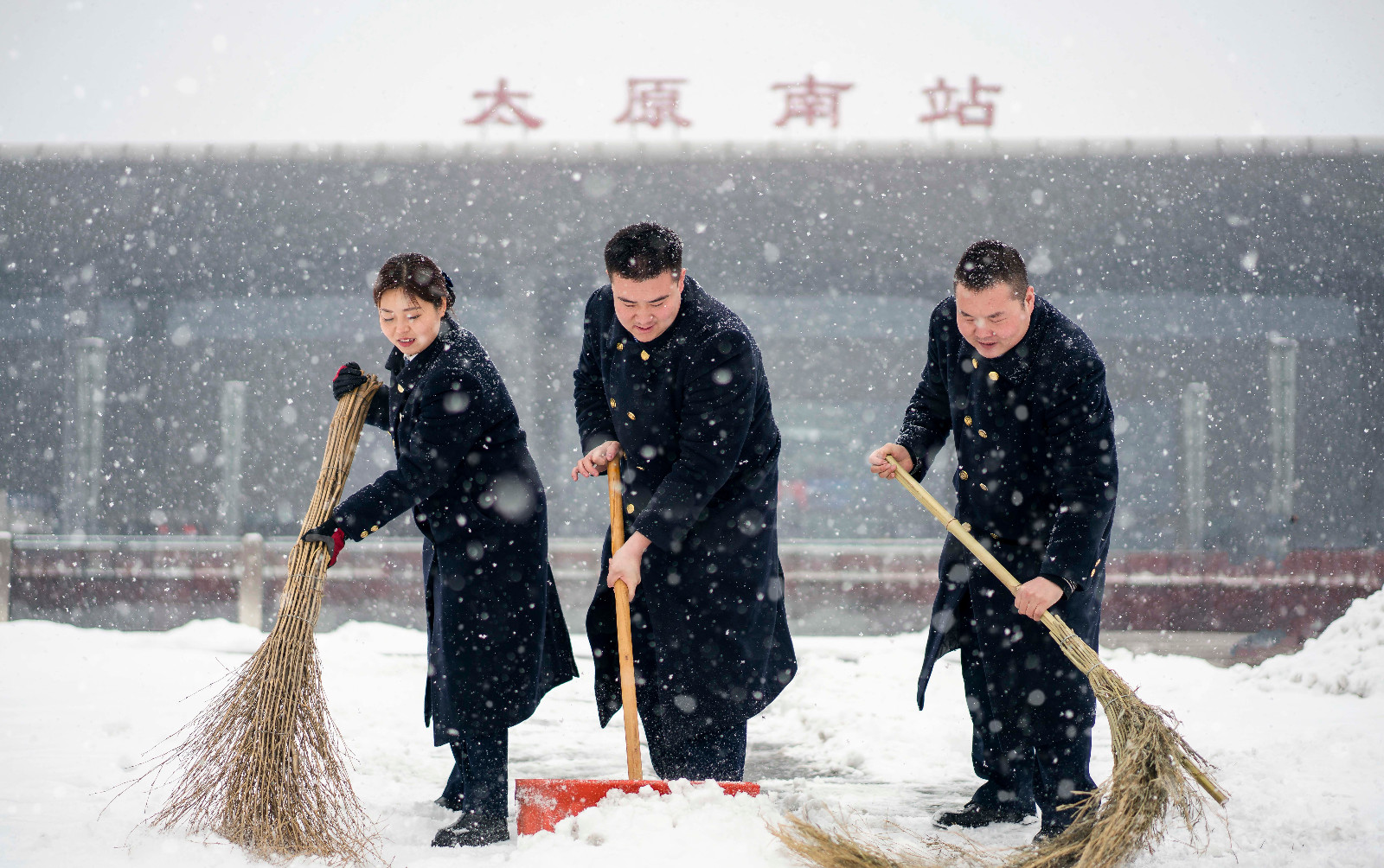 今天是春運最后一天,山西運城市大雪彌漫。運城車站派出所執勤民警和侯馬北鐵路供電段運城電力工區員工在車站站臺清掃積雪,疏導秩序,幫扶行走不便的旅客,防止溜滑摔倒,保證他們出行平安和春運善始又善終。