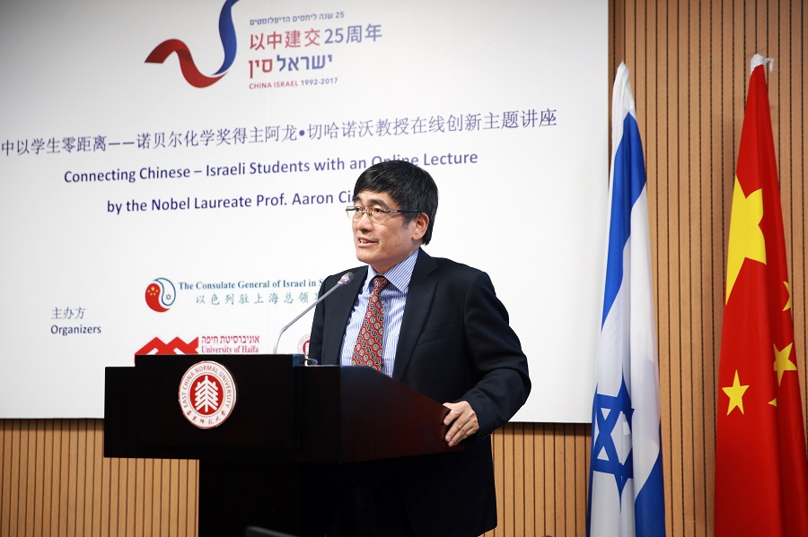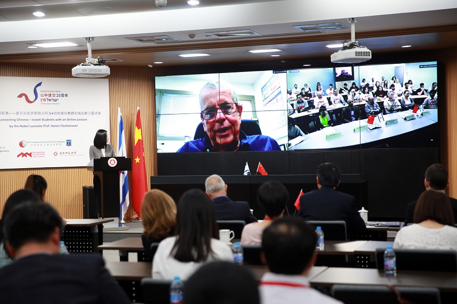 央廣網(wǎng)上海5月24日消息(記者傅聞捷)為紀(jì)念中以建交二十五周年,“中以學(xué)生零距離——諾貝爾化學(xué)獎得主阿龍·切哈諾沃教授在線創(chuàng)新主題講座”昨天在華東師范大學(xué)舉行。本次活動由華東師范大學(xué)、以色列駐上海總領(lǐng)事館和以色列海法大學(xué)聯(lián)合舉辦。