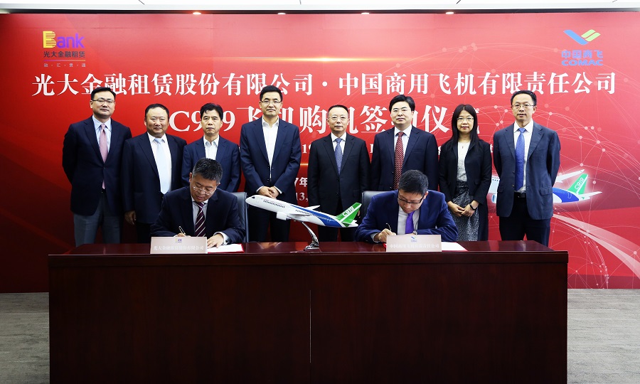 中國光大銀行行長張金良、中國光大銀行副行長兼光大金融租賃董事長張華宇、光大金融租賃總裁潘明忠,中國商飛公司總會計師田民出席簽約儀式。